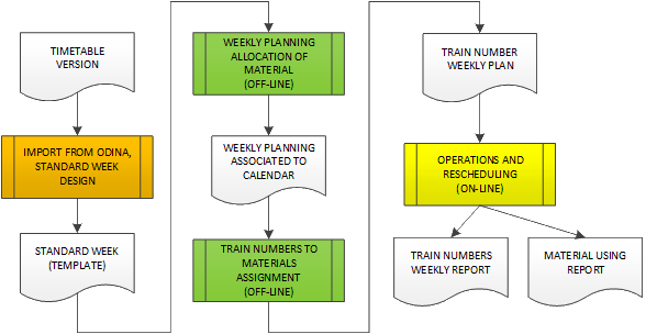 GeMat definisce tre principali procedure operative tramite le quali l'utente a partire dalla definizione di un orario ferroviario e relativa associazione dei materiali, può costruire un modello di settimana per l'esercizio, associare ed adattare il modello settimanale alle settimane da calendario ed agire durante la programmazione giornaliera per risolvere problemi di esercizio come guasti, soppressioni indisponibilità: